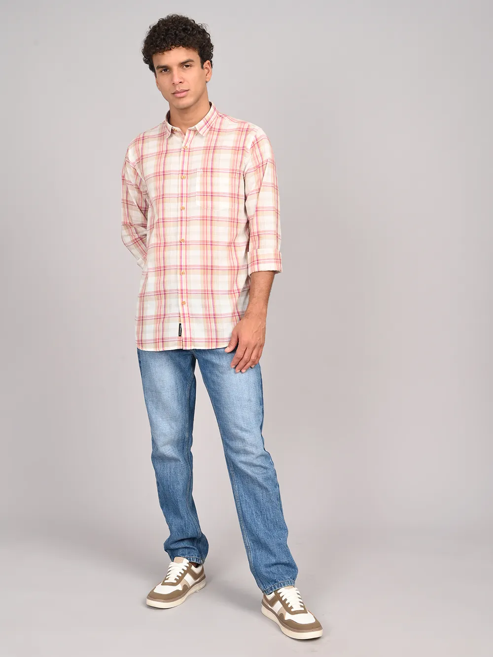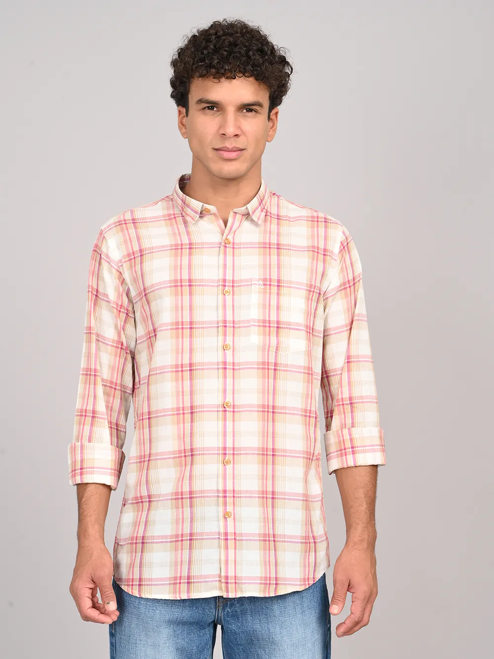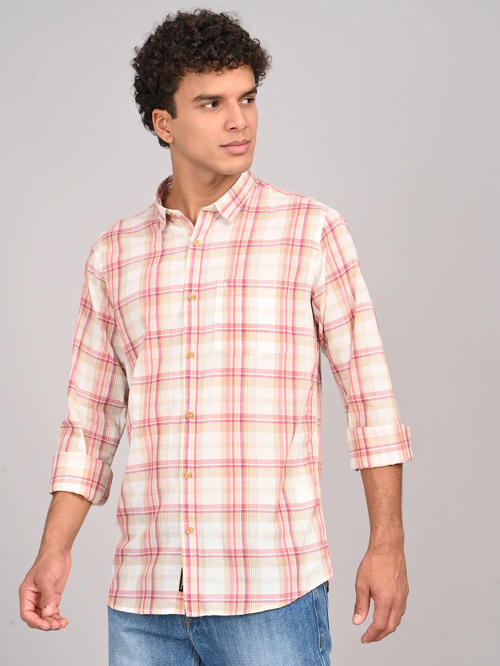 Beige & Cream Checked Full Sleeve Regular Fit Shirt