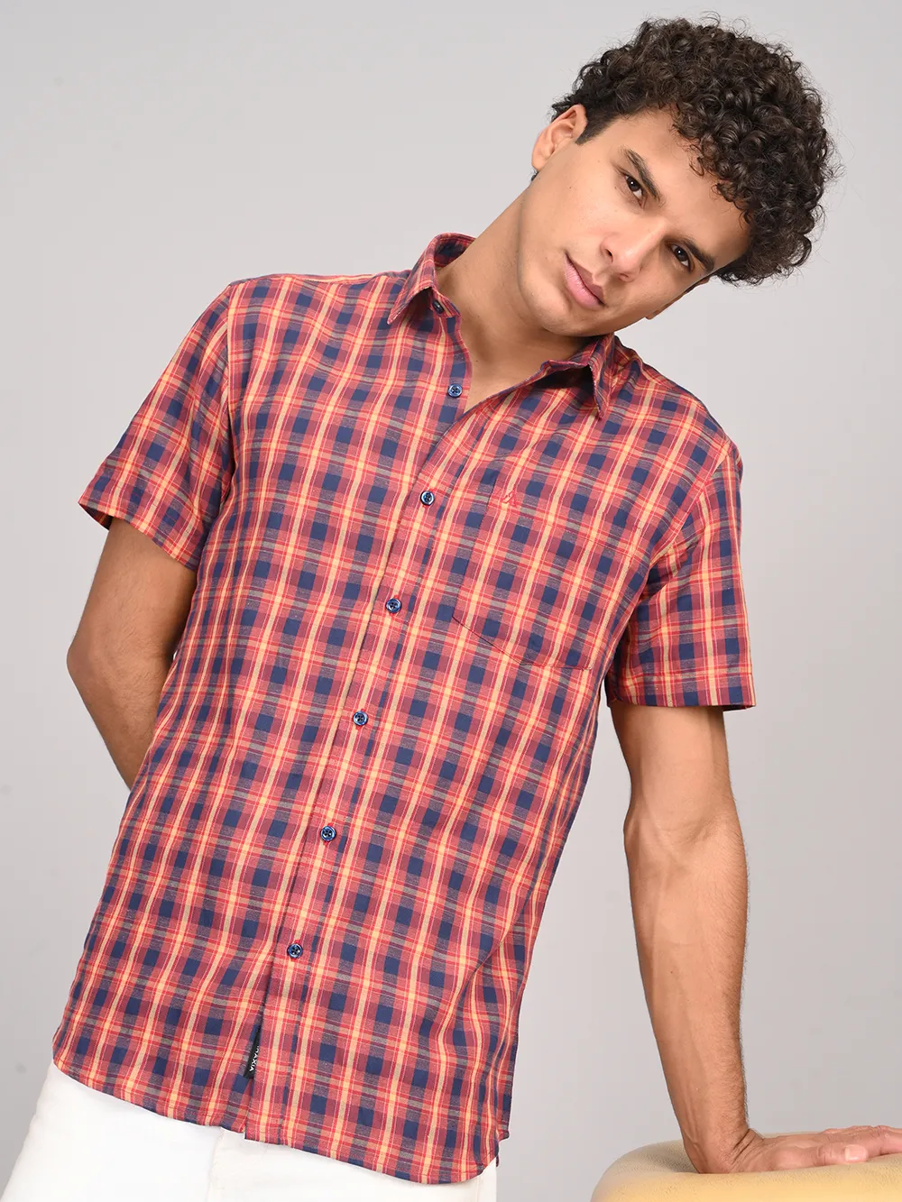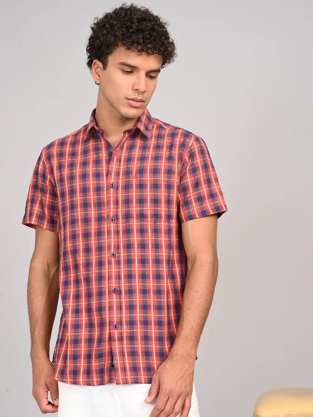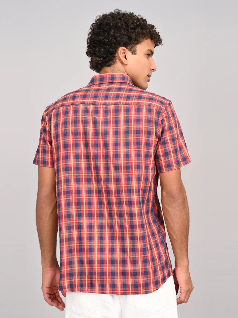Refresh your everyday style with ATARAXIA’s Red & Blue Check Half Sleeve Cotton Shirt. Designed in a regular fit for easy comfort, this shirt features a vibrant blend of red and blue checks that add a touch of boldness to your casual wardrobe. Crafted from premium-quality cotton, it ensures excellent breathability and softness, keeping you cool and comfortable throughout the day. The half sleeves and smart collar give it a versatile appeal, making it perfect for both relaxed weekends and casual outings. Pair it with jeans, chinos, or shorts to create a confident and effortlessly stylish look.