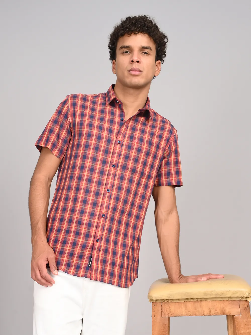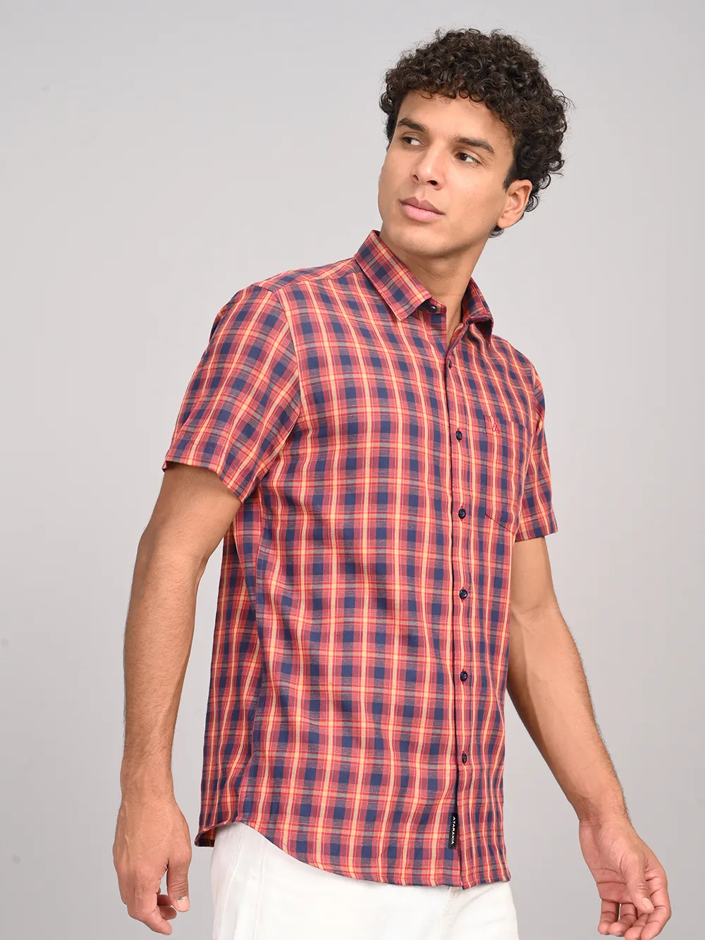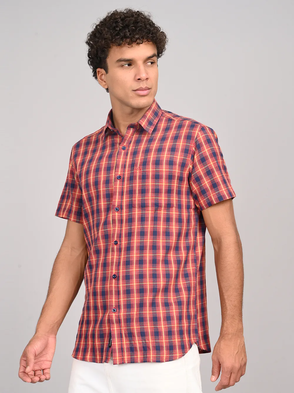 Refresh your everyday style with ATARAXIA’s Red & Blue Check Half Sleeve Cotton Shirt. Designed in a regular fit for easy comfort, this shirt features a vibrant blend of red and blue checks that add a touch of boldness to your casual wardrobe. Crafted from premium-quality cotton, it ensures excellent breathability and softness, keeping you cool and comfortable throughout the day. The half sleeves and smart collar give it a versatile appeal, making it perfect for both relaxed weekends and casual outings. Pair it with jeans, chinos, or shorts to create a confident and effortlessly stylish look.